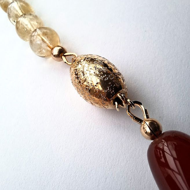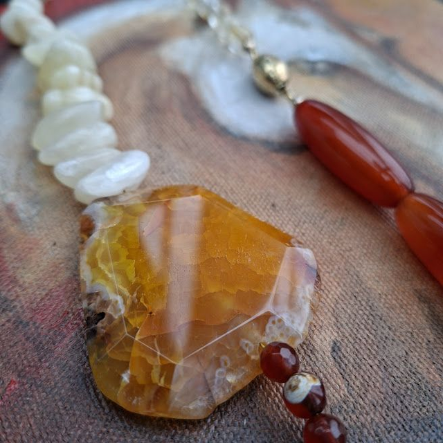 Zonnig collier met agaat, vuuragaat, butter jade en citrien met een verguld zilveren ovaal slot.