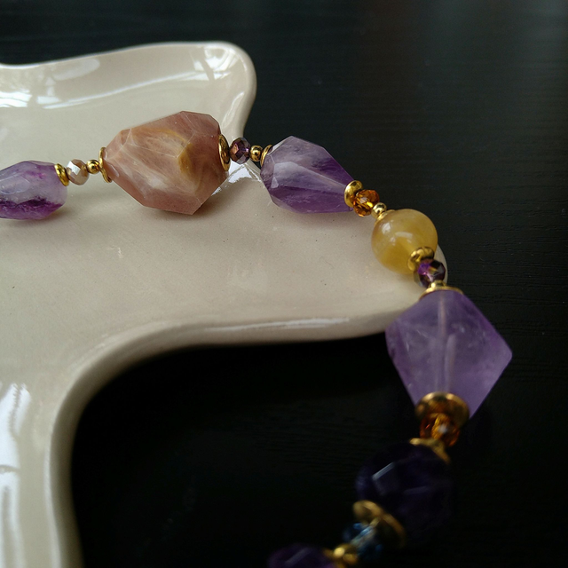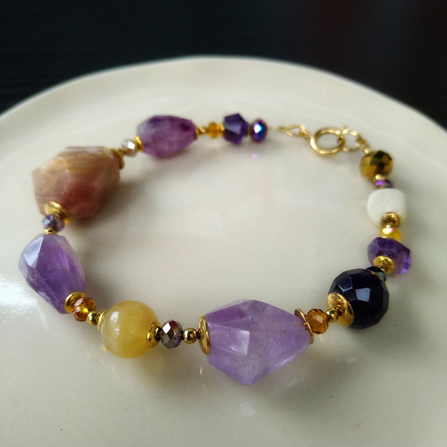 Verguld zilveren armband met verschillende soorten edelstenen. De gebruikte stenen zijn: amethist, agaat en kristal.