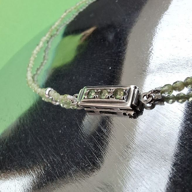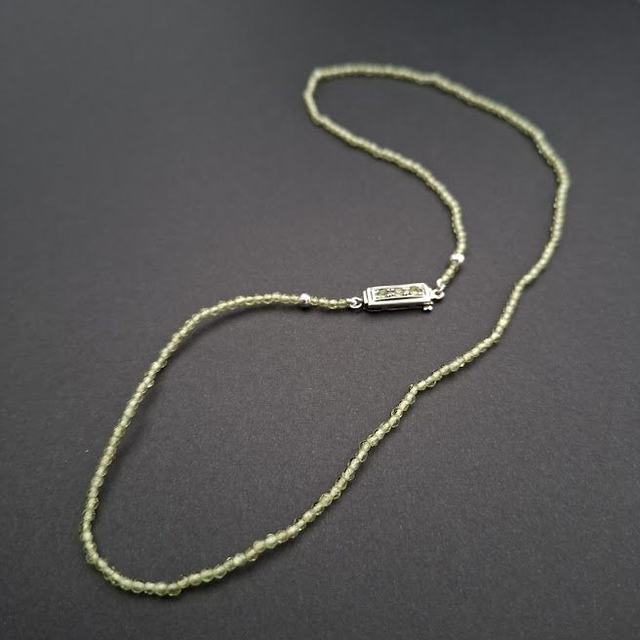 Een collier van nieuwe facet geslepen peridoot kraaltjes gecombineerd met een oud zilveren slotje met drie steentjes.