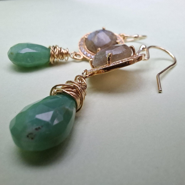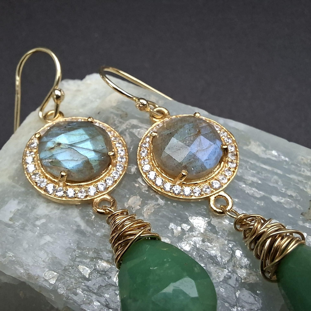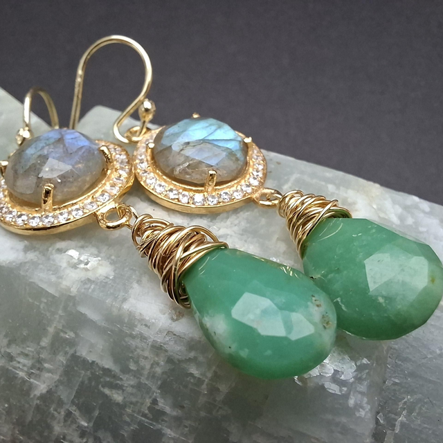 Verguld zilveren oorbellen met labradoriet en zirconia en druppels van chrysopraas.